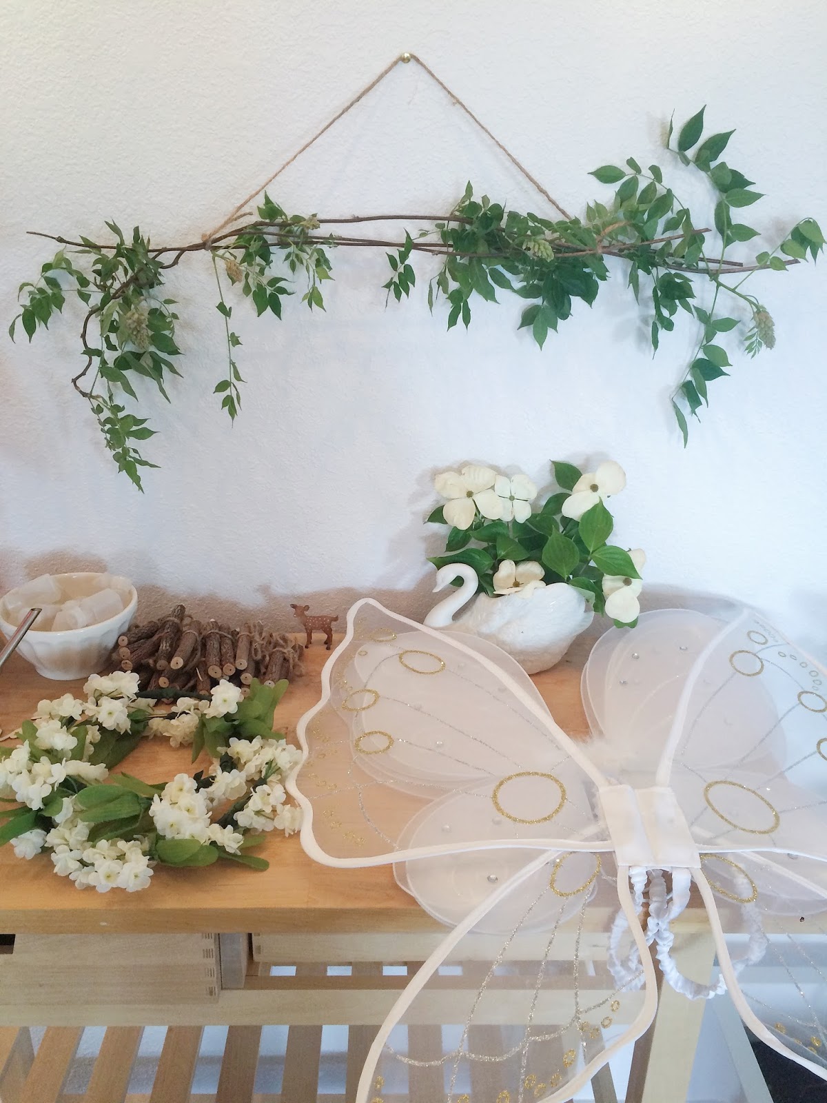 For Emery's party we threw a "forest fairy party" using a neutral color pallet of white, gold, and natural elements like greenery, twig pencils, and floral crowns. I used mainly things we already had on hand, with a few new items thrown in the mix. I set everything up the day before the party with the exception of the greenery. since I knew it'd all wilt quickly, I saved gathering it all up until right before the party started. The kiddos and I foraged vines and branches from around our yard that we then tied twine around and hung up on the walls using gold thumb tacks. Watching Em's face light up as she spotted the perfect vine really was the sweetest, and I couldn't help but smile a little too. Letting Emery have a say in even the smallest details really added a touch of magic I think.